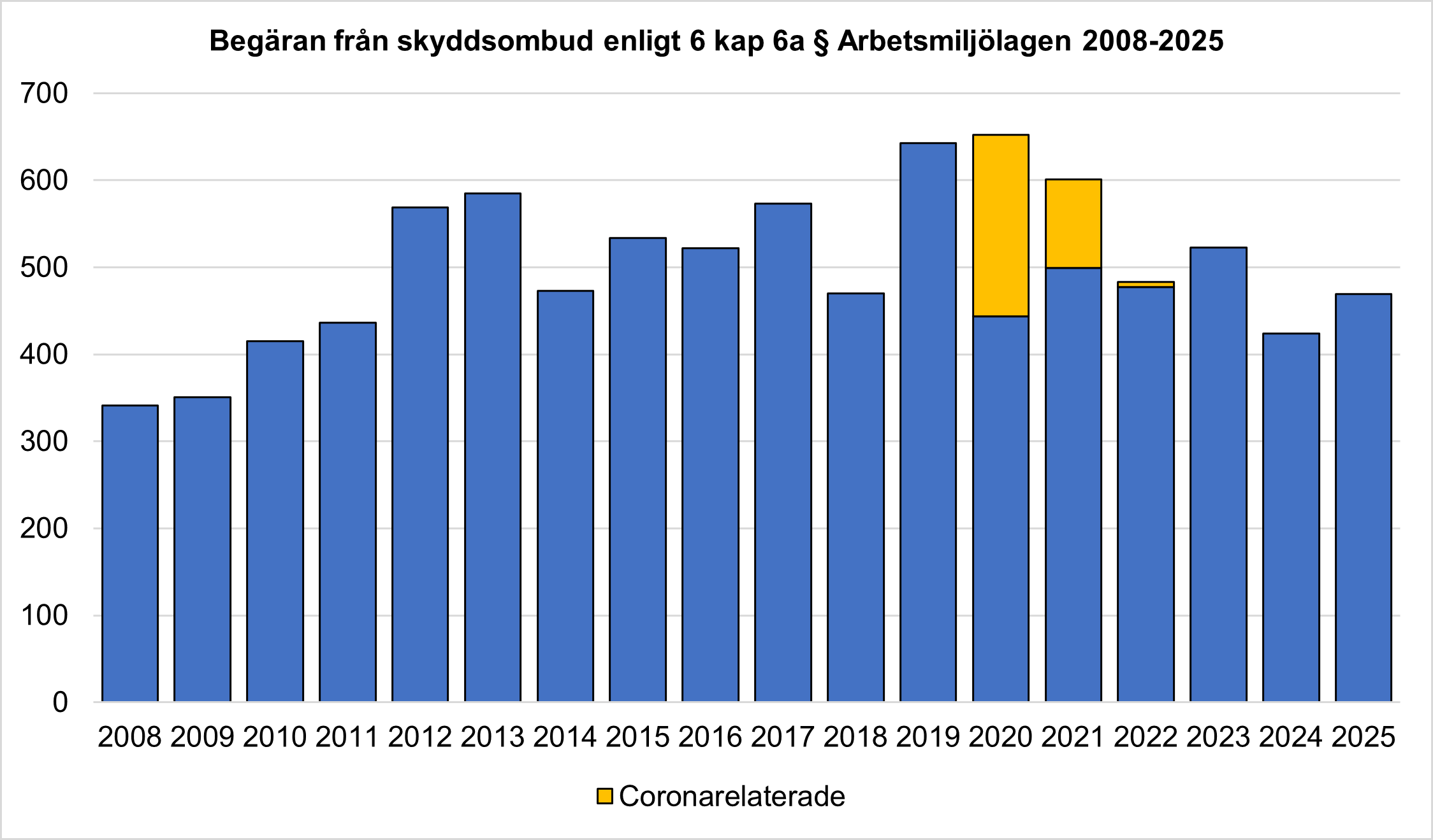 Ett skyddsombud har enligt 6 kap. 7 § arbetsmiljölagen rätt att avbryta ett arbete som innebär en omedelbar och allvarlig fara för liv eller hälsa och där arbetsgivaren inte omedelbart rättar till arbetsmiljörisken. I diagrammet visar vi antalet skyddsombudsstopp som lett till ett ärende hos oss.