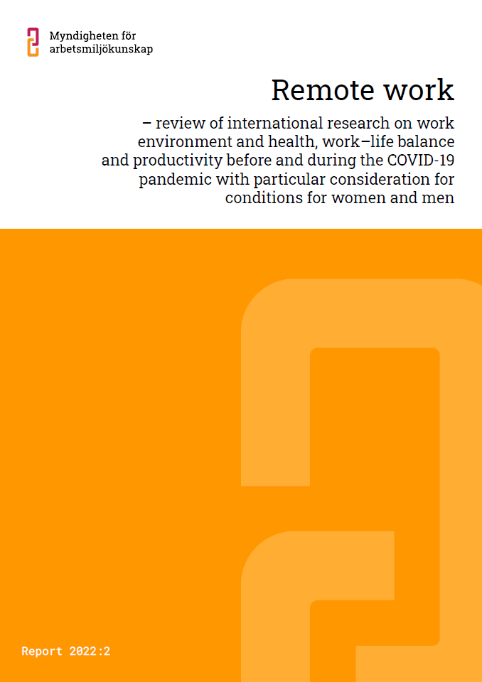 The pandemic has changed how we organise working life, perhaps forever. The boundaries between working life and private life, as well as between the workplace and the individual’s private sphere have become more elastic. New forms of work, new approaches to leadership and self-leadership among employees, and to the work environment overall are in the process of emerging. As the third report in a series of literature reviews and analyses of the pandemic’s impact on the work environment in Sweden, the Swedish Agency for Work Environment Expertise has produced a new literature review of the work environment, health, work–life balance and productivity with remote work before and during the COVID-19 pandemic, with particular consideration for the conditions of women and men.