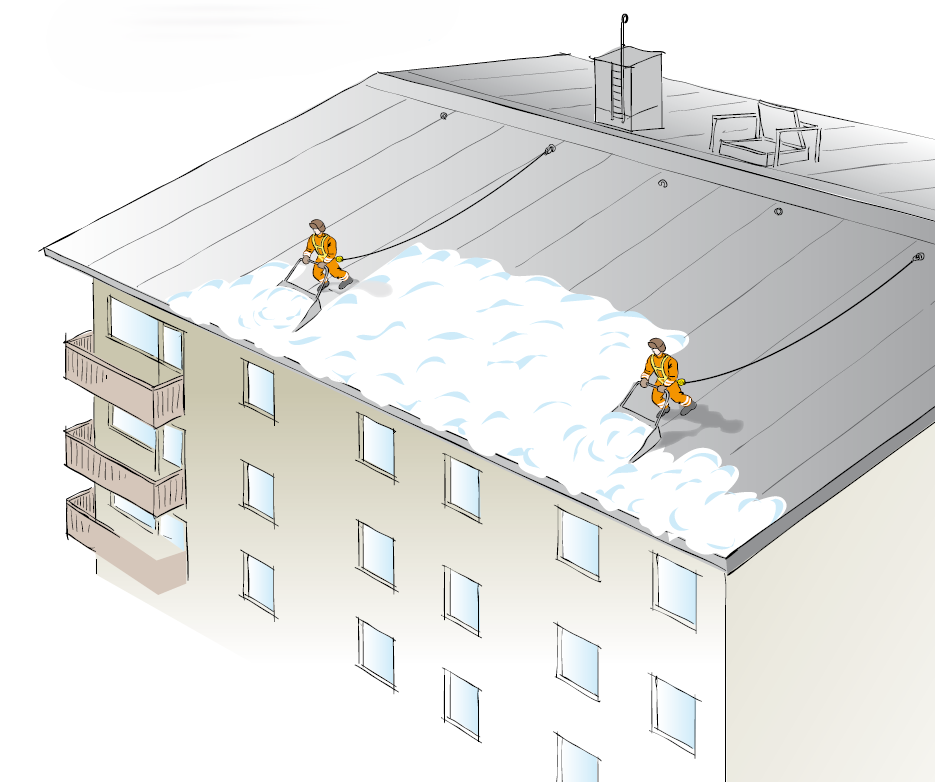 På vintern gör snö, is, kyla och blåst att det blir extra farligt att arbeta på tak. Planera därför väl, så att ni kan utföra arbetet på ett säkert sätt. Kanske går det att använda teknisk utrustning eller arbeta från en arbetskorg? Om ni måste skotta för hand – använd alltid skyddsutrustning.