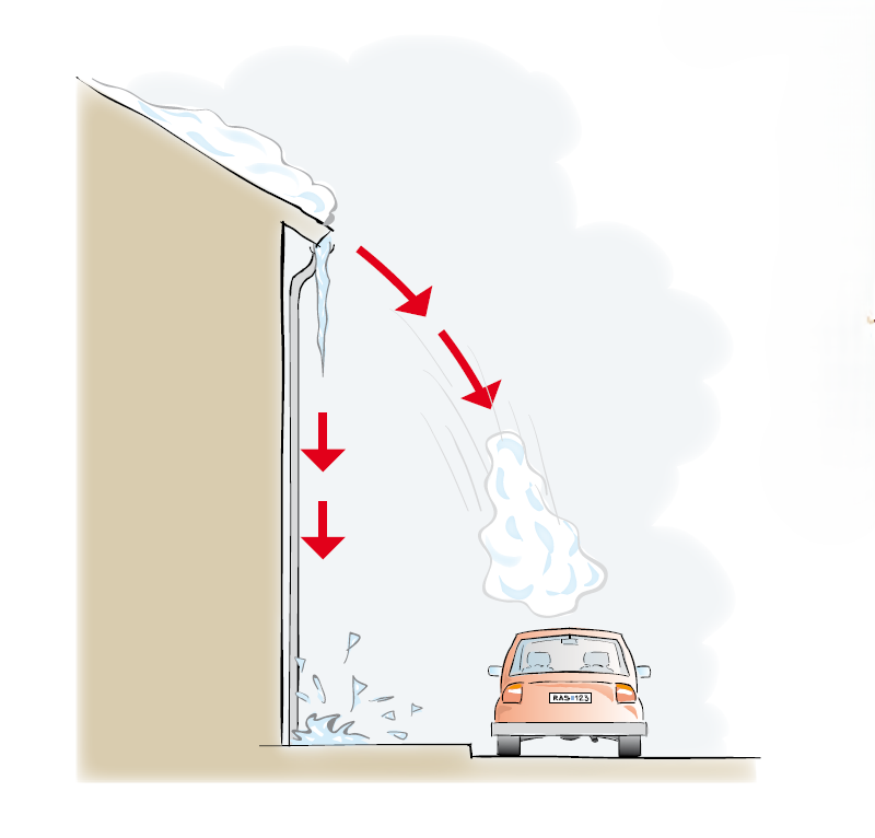 - Snö som glider ner utefter taket kan landa längre ut från huset där det kan saknas avspärrning.